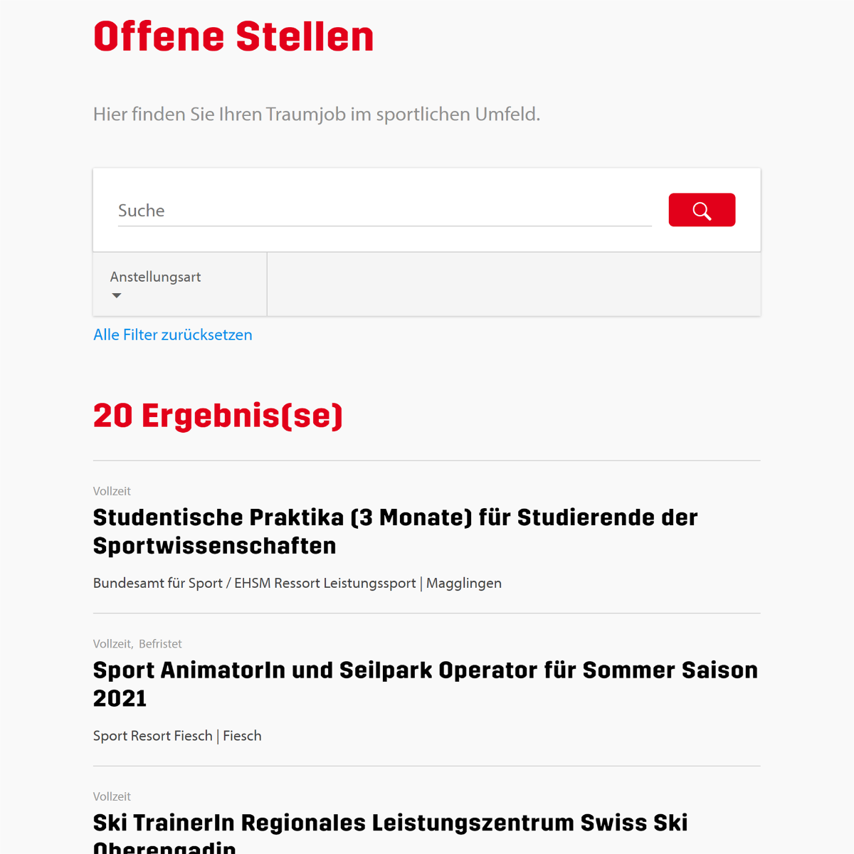 Die Sportjobs-Inserate werden auf der Verbandswebsite mittels direktem Zugriff auf das Sportjobs-Backend via REST-Schnittstelle angezeigt.